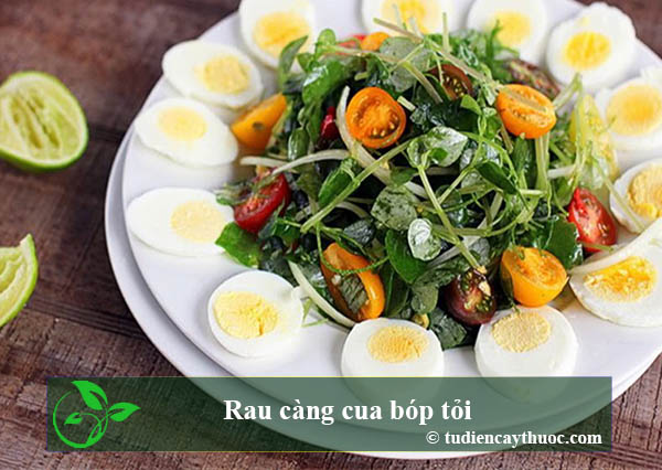 - Rau càng cua bóp tỏi: món ăn này đơn giản hơn. Càng cua chỉ cần rửa sạch ngắt khúc ngâm qua với nước muối. Phi dầu thơm cho tỏi vào vừa vàng là tắt bếp. Nêm nếm vừa ăn và thêm chanh. Cho càng cua vào bóp nhẹ là có thể dùng. Vừa ngon vừa giòn, chua rất dễ ăn và bổ dưỡng. Nhất là vào những ngày nắng nóng.